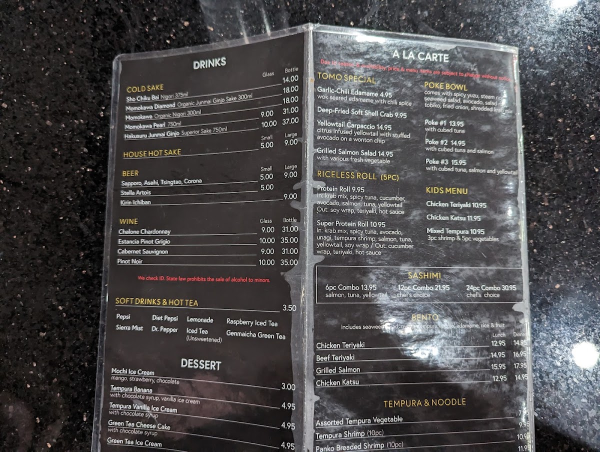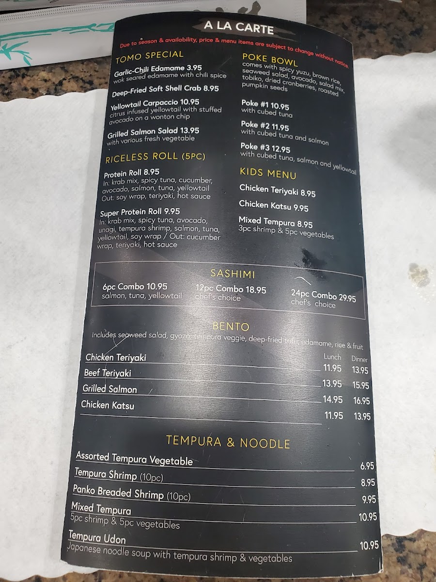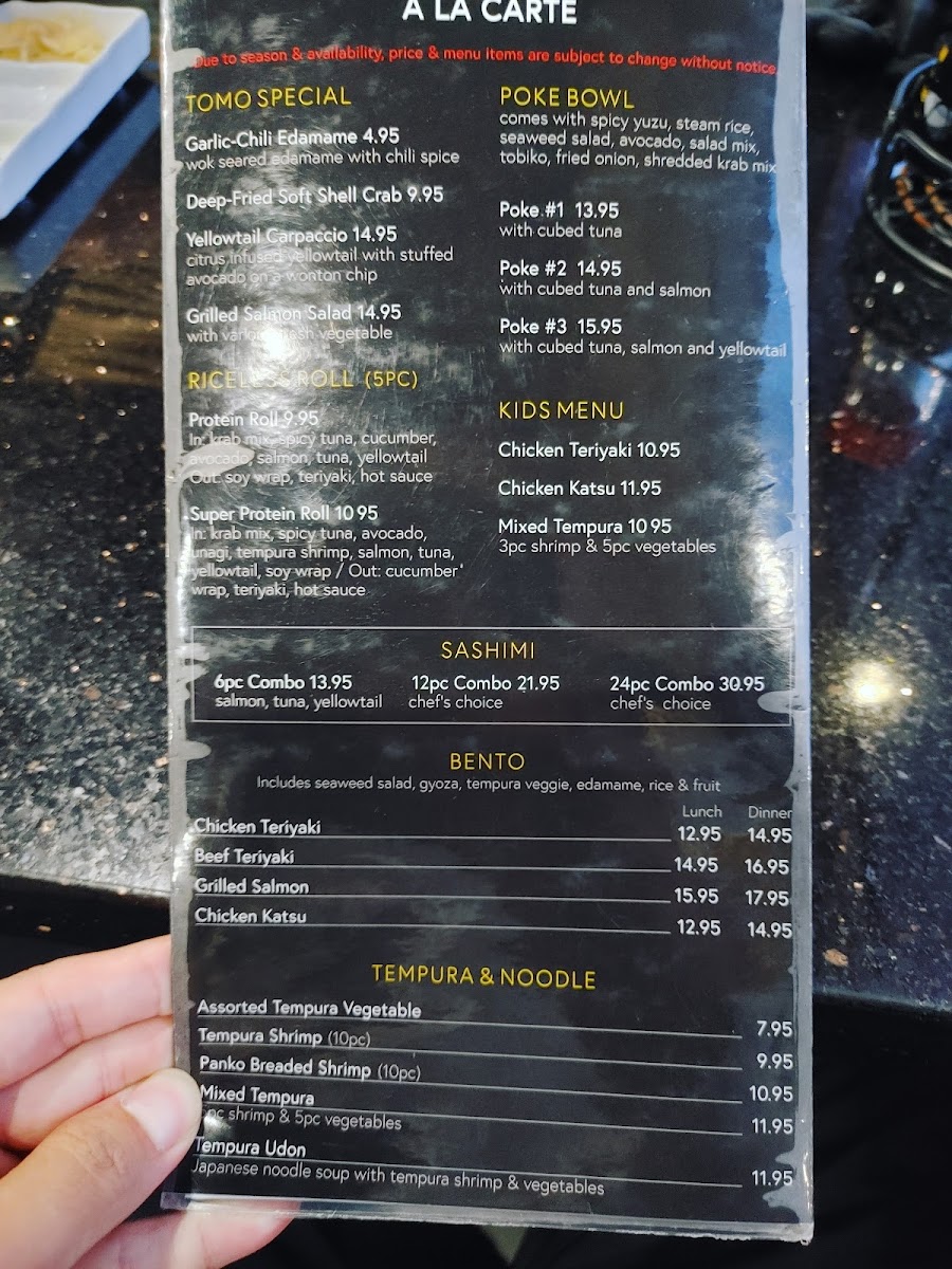 When it comes to selecting from the menu, you’ll find a plethora of enticing options that highlight the freshness and creativity of Tomo Sushi & Grill. Among the favorites are the Godzilla Roll, with its perfect blend of salmon and yellowtail, topped with green onion, teriyaki, and a kick of spicy mayo for only $9.95. Another must-try is the Tahoe Roll, combining salmon and cream cheese with a striking heat thanks to jalapenos and cilantro, finished with teriyaki sauce, also for $9.95.
